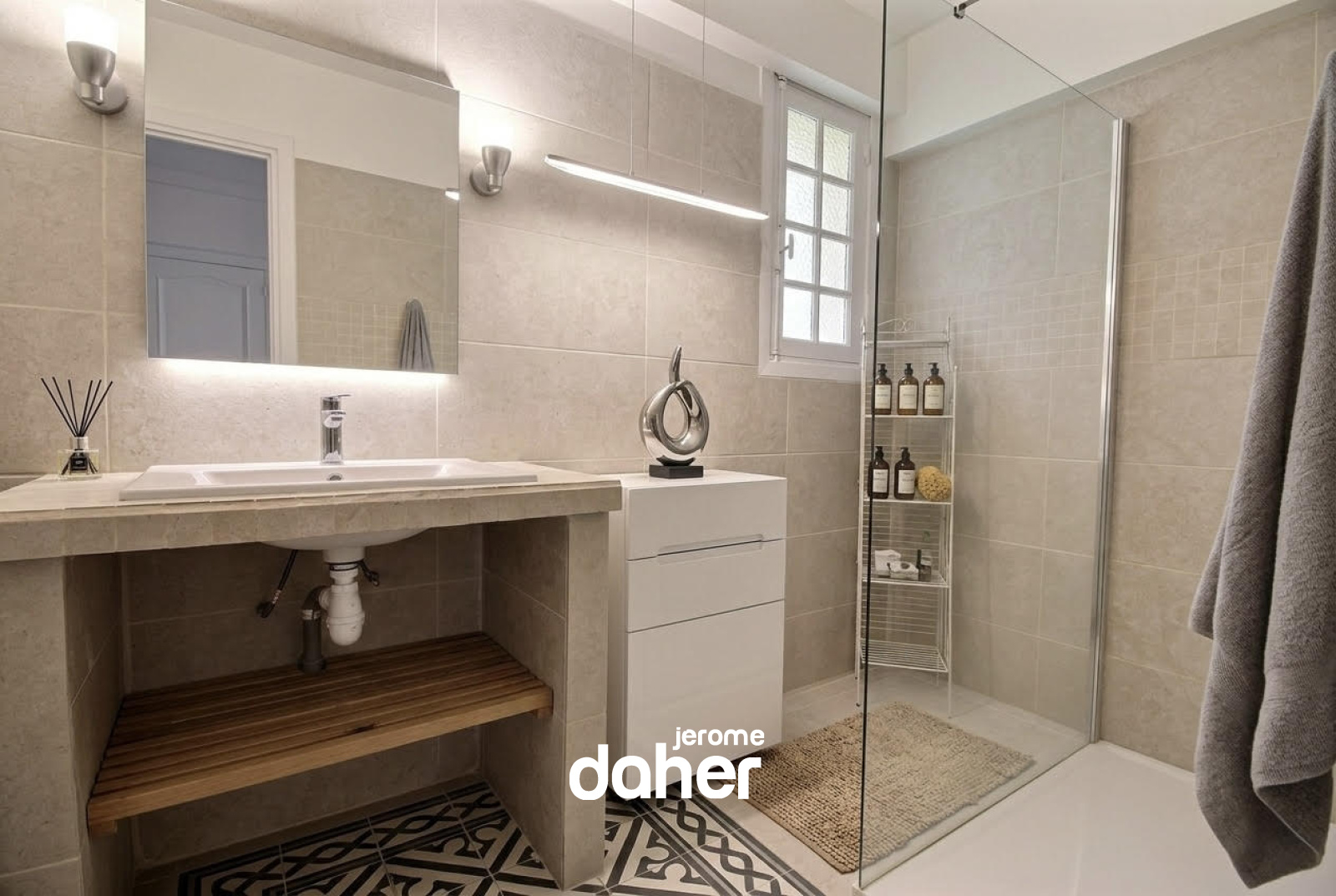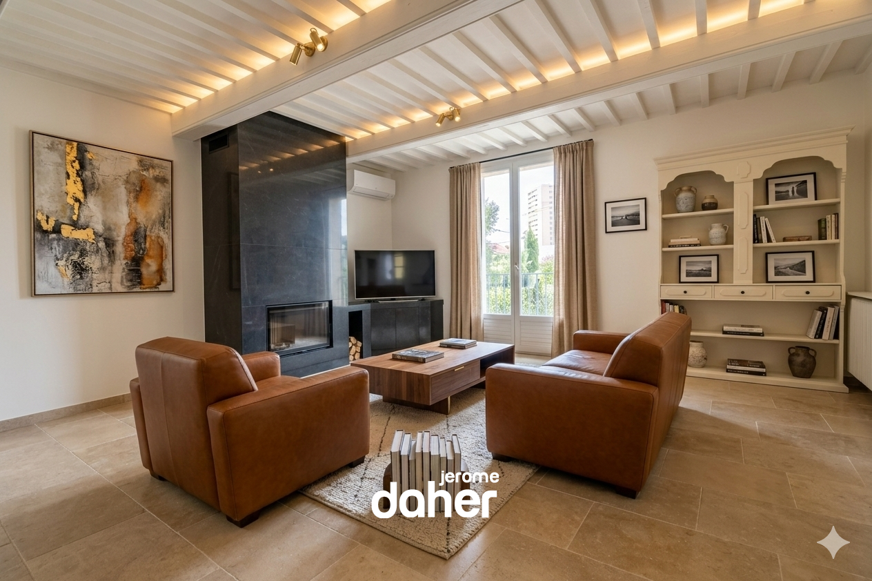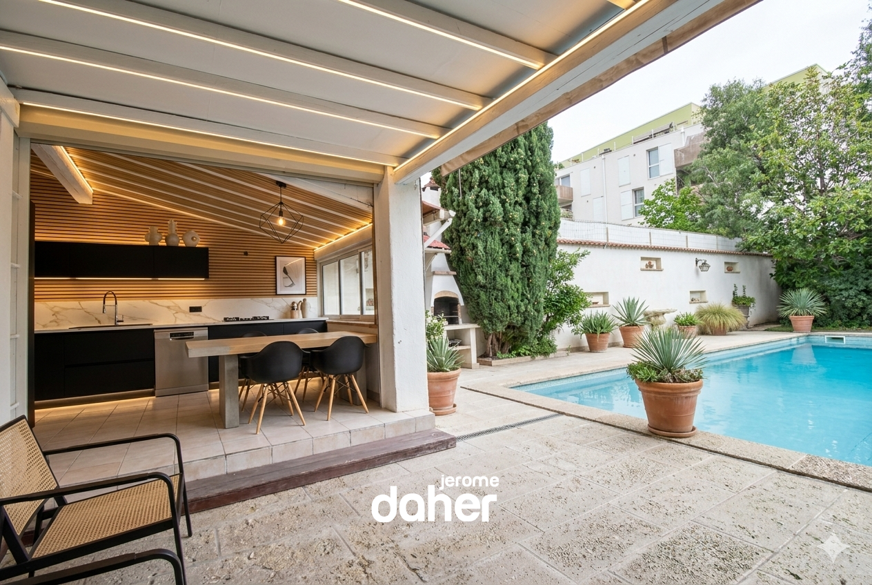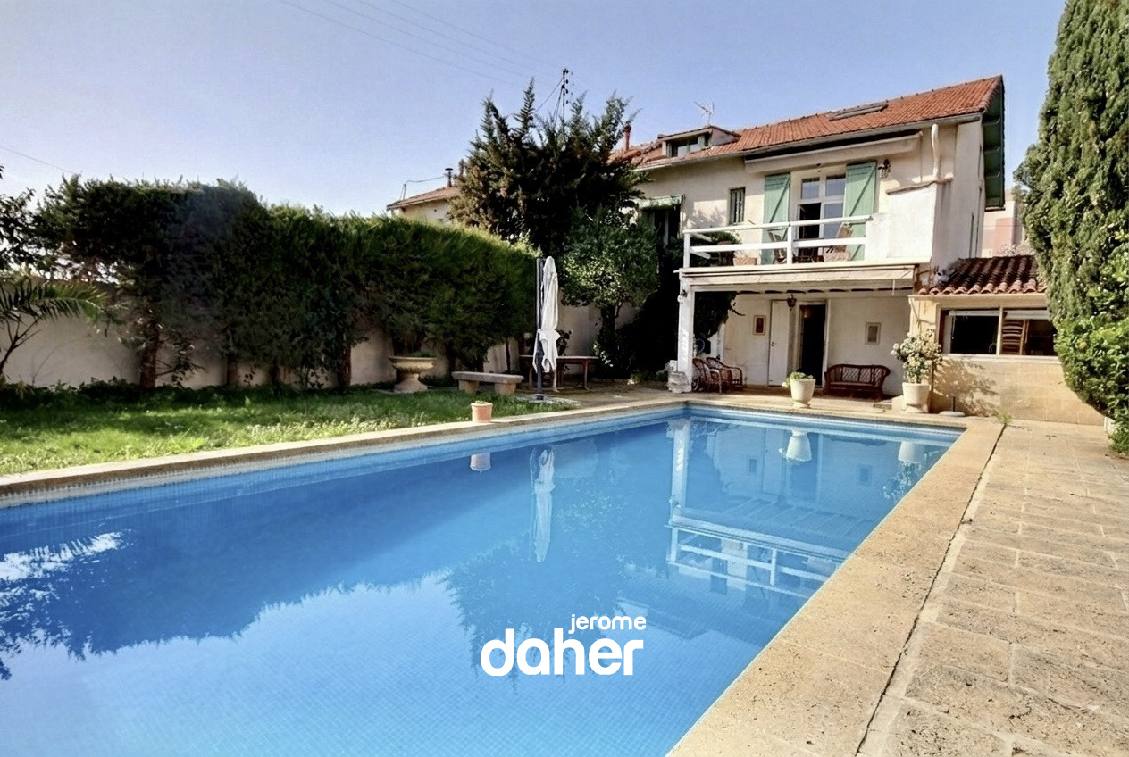 Entre Saint-Pierre et La Pomme, dans une rue résidentielle, découvrez cette vaste maison de 170 m² habitables (186 m² au sol) située sur une parcelle d'environ 500 m² avec jardin et piscine au calme. Exposée Est-Ouest, ce bien profite d'une belle luminosité traversante tout au long de la journée. Les espaces d'habitation se répartissent sur 3 niveaux. Le rez-de-chaussée comprend une entrée, deux grandes chambres de 19 m², une salle d'eau rénovée, une buanderie et un WC. Au premier niveau, vous profiterez d'un spacieux salon-salle à manger, avec cheminée, ainsi que d'une cuisine donnant accès à une agréable terrasse ensoleillée dominant le joli jardin. Le second étage, sous combles, accueille une chambre de 24 m², une salle de bains ainsi qu'un espace bureau et coin lecture. L'extérieur constitue un véritable atout avec sa grande piscine, sa terrasse et une cuisine d'été sous terrasse couverte. L'accès est sécurisé par un portail permettant le stationnement de deux ou trois véhicules (abris voiture). Des travaux de rénovation énergétiques et un rafraîchissement global sont à prévoir pour révéler tout le potentiel de ce bien, qui est parfaitement entretenu et sain. La taxe foncière est de 4356 €. A 2mn des accès autoroutiers. Contact : Jérôme Daher - 06 82 56 98 98 ou Agence - 04 91 47 56 05