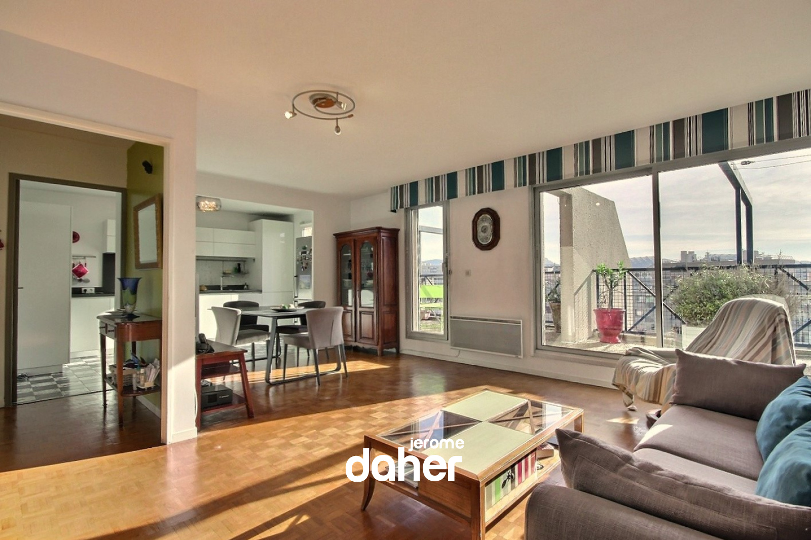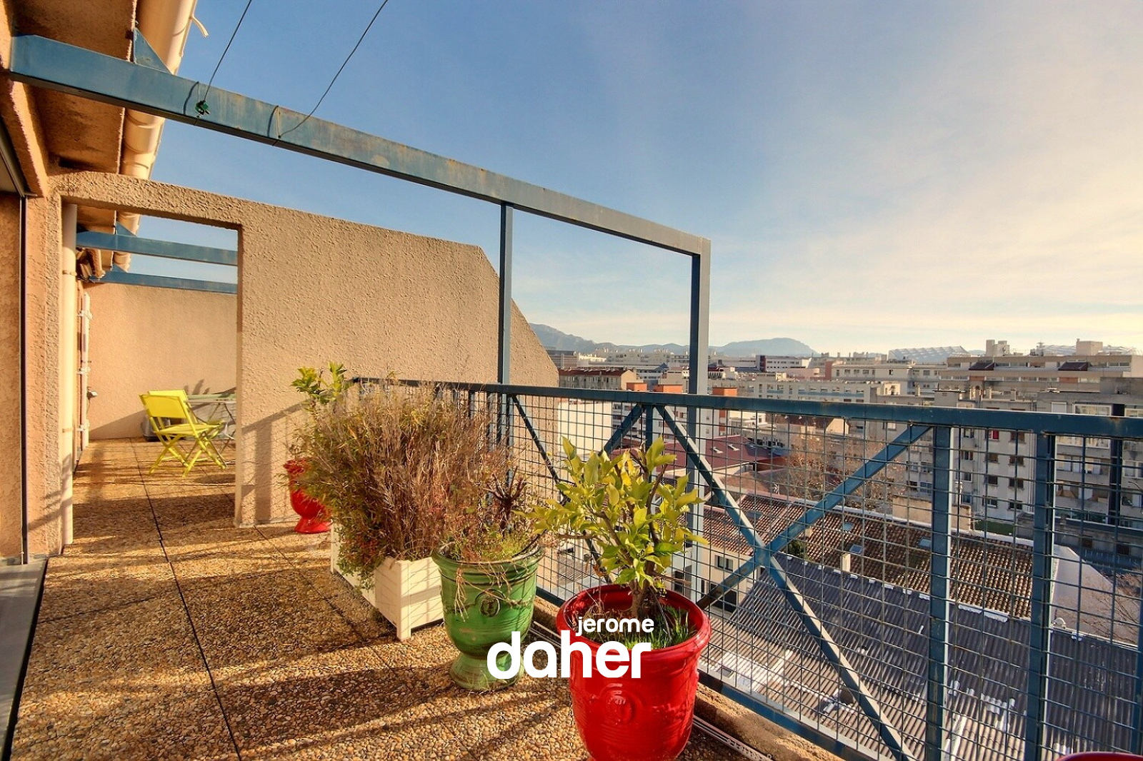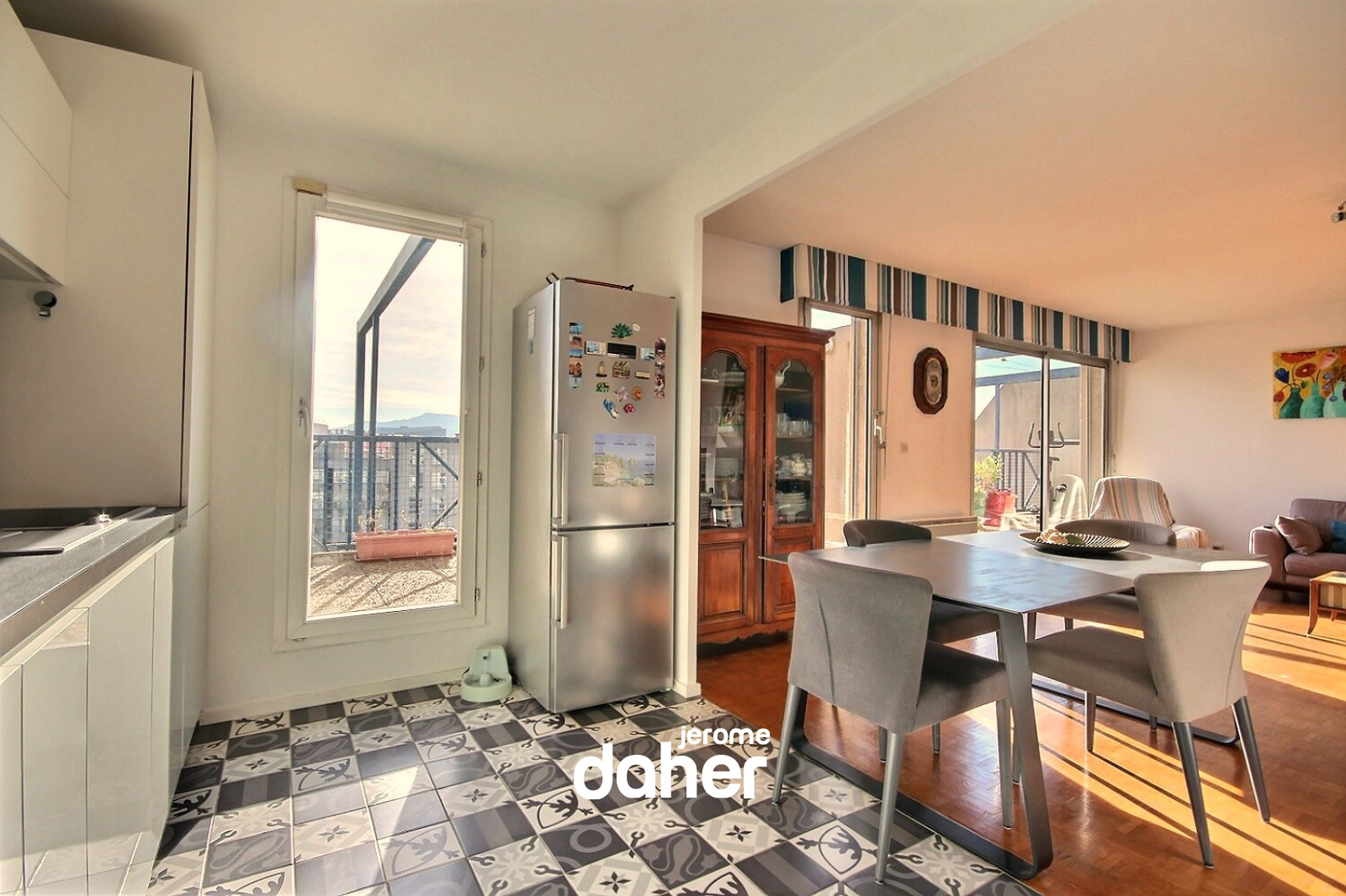 Nous aimons : le soleil et la vue, la grande terrasse offrant un bel espace de vie, la situation proche du métro Perier.