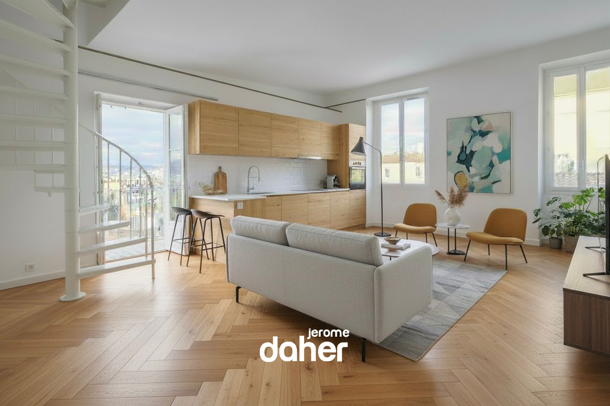 Baille : Duplex T4 traversant (Nord-Est/Sud-Ouest), en dernier étage, de 80m², comprenant un séjour, illuminé par 3 fenêtres, avec une cuisine américaine aménagée, un couloir desservant 2 chambres et une salles de bains, ainsi qu'un W.C indépendant. À l'étage, un généreux palier pouvant accueillir un espace en bureau, une salle d'eau avec W.C et une grande chambre, éclairée par un Velux. Il dispose également d'un système de climatisation réversible dans le séjour ainsi qu'à l'étage. Ce bien est en bon état, il n'y a pas de travaux à prévoir. Un emplacement à deux pas des commerces et dans un quartier vivant. Charges mensuelles de 135€ et taxe foncière de 1 193€. Contact : Jérôme Daher 06 82 56 98 98 - Agence 04 91 47 56 05 Les informations sur les risques auxquels ce bien est exposé sont disponibles sur le site Géorisques